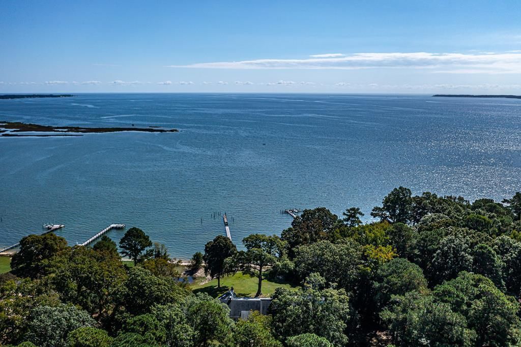 On a picturesque country lane at the confluence of the Rappahannock River and the Chesapeake Bay, this exceptional property showcases the remarkable features of its setting: stunning vistas of the Bay, a narrow barrier island, a sandy shoreline, breathtaking sunrises, and the moonrises on the shimmering Rappahannock River. A winding lane meanders through the park-like grounds with expansive lawns and mature trees, offering glimpses of the Bay. Built in 1940, this rambling Tidewater design is situated on a knoll, providing privacy and elevation. The home boasts a spacious living room with a masonry fireplace, which opens onto a large deck. This deck extends the length of the house and highlights the spectacular view, allowing you to enjoy the soothing sound of waves lapping the shoreline and gentle bay breezes. The light-filled dining room is simple yet elegant. For a more relaxed gathering space, there is the cozy family room with a full bath. Overlooking the water, the kitchen includes a bright breakfast nook. The expansive first-floor primary bedroom features its own fireplace and private riverside deck. Two walk-in closets complement the spacious bathroom. The second floor is divided by an upper hall with an office, two bedrooms, a bath on one side, and a hall bath with two bedrooms on the other. A screened porch opens to the pool terrace, ideal for outdoor entertaining. The 3-bay garage can house cars, boats, bikes, golf carts. Down the gentle hill is a waterside deck leading to the private dock & sand beach. This is the perfect place to create enduring traditions.